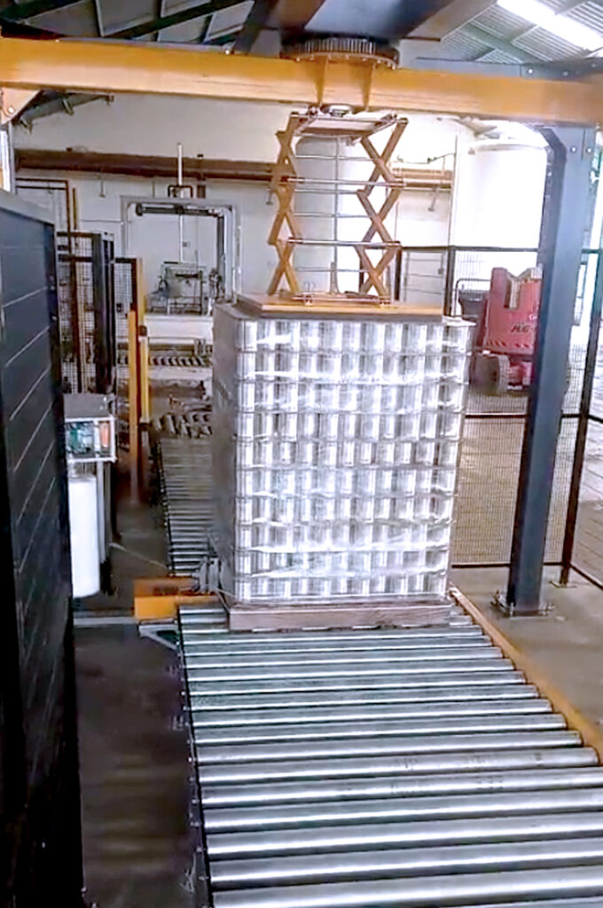 - Top press accessory for load stability: The wrapper incorporates a top press device to secure the load during wrapping—a common requirement for light, fragile, or unstable loads. In Riberega’s case, many of their products are packaged in cans or glass containers that could topple during wrapping, making this reinforcement essential. The top press features a motorized scissor-lift system that adjusts its descent smoothly to avoid impacting or damaging the load.