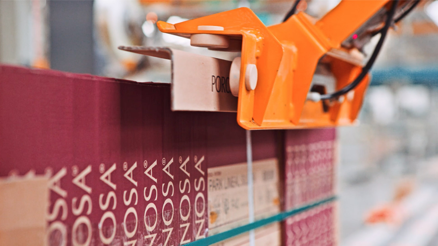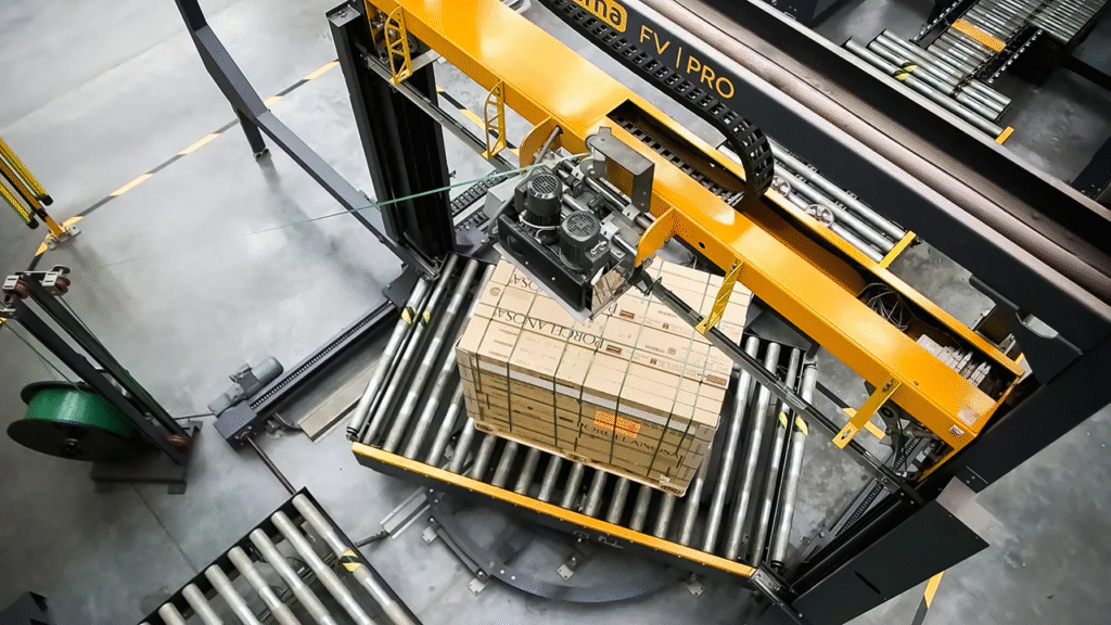 The automatic vertical strapping system secures the load directly to the pallet base, creating a compact and stable unit that reduces the risk of load shifting. The system applies the strap vertically with controlled and uniform tension, ensuring a firm fixation without deforming the product.