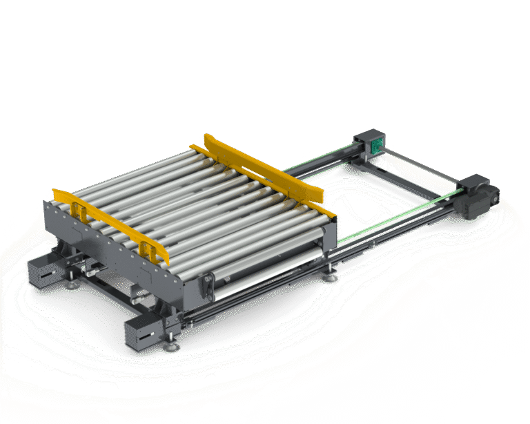 A guiding mechanism installed beneath the conveyor that enables horizontal pallet movement to connect parallel production lines.