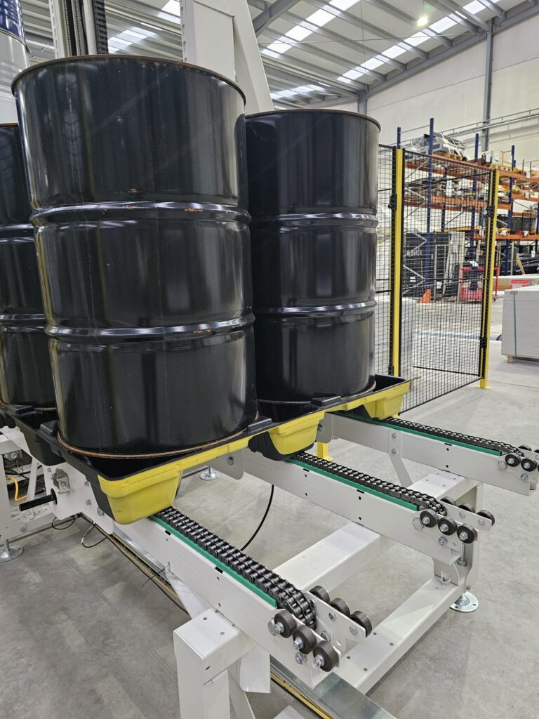 The 90° transfer system combines roller and chain conveyors to move pallets laterally. It is a perfect solution for connecting multiple pallet infeed lines without the need for rotating platforms.