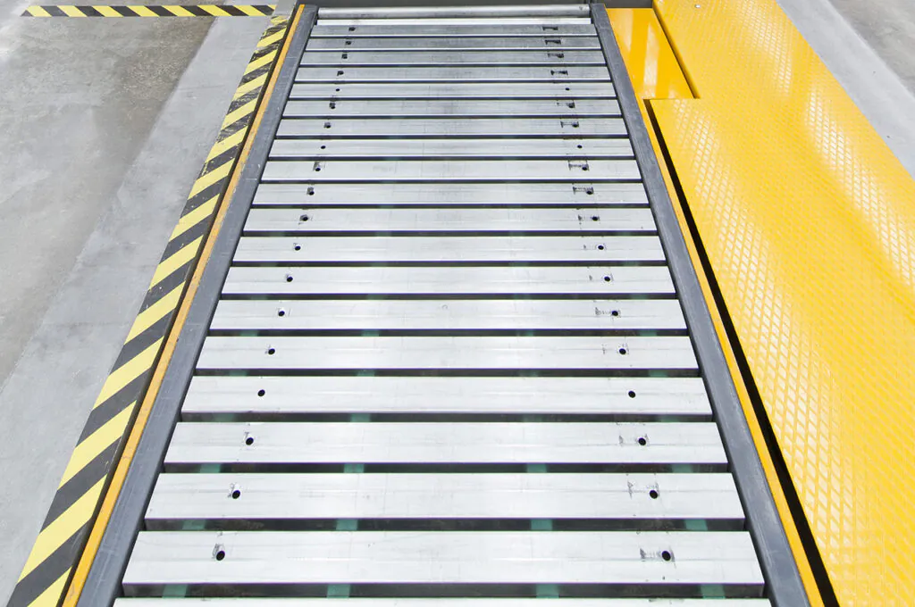 The slat conveyor is designed to integrate into lines that require greater accessibility, such as for manual pallet jacks or forklifts. Unlike rollers, slats cannot support as much weight, making this system more suitable for light or medium loads, typically transported on plastic pallets or smaller formats.