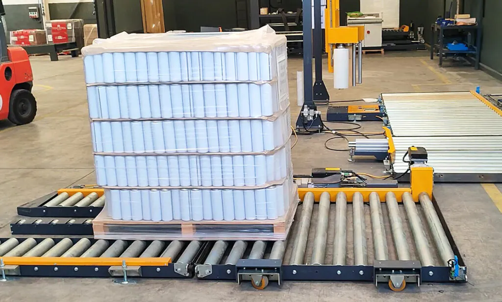 The rotating platform is a conveyor that allows the pallet to rotate 45° or 90°, depending on line layout requirements. This turning system is especially useful when the plant design requires changes in direction or when the load needs to be strapped on all four sides of the pallet. Its robust design allows the palletized load to rotate safely without compromising stability.